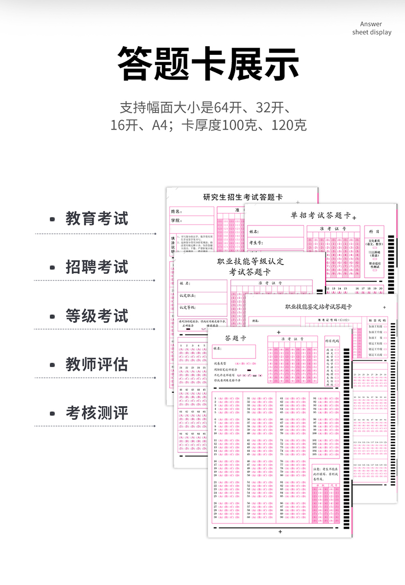 主要應(yīng)用于學校,培訓機構(gòu),職業(yè)鑒定站,考試評卷、考試報名、志愿統(tǒng)計、各行各業(yè)的干部測評、考核、選舉,特別是全國性的人口、工業(yè)、農(nóng)業(yè)、林業(yè)等行業(yè)用卡量多和時間緊迫且要求準確率更嚴格的讀卡。機器免調(diào)試。